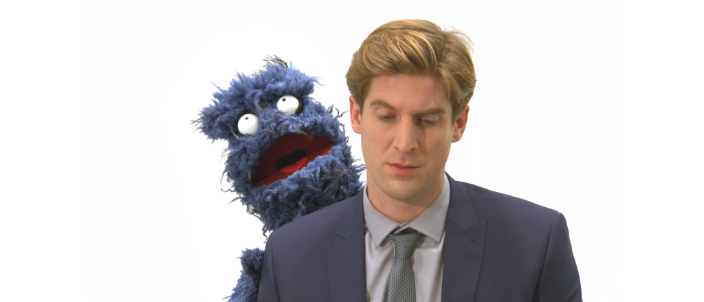 Alex McQueen staring up whilst by a water cooler with a woman.