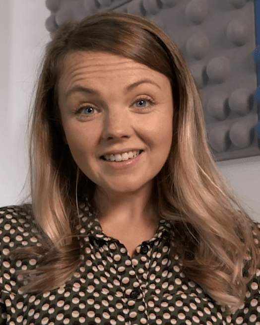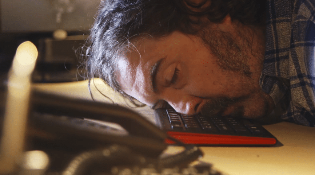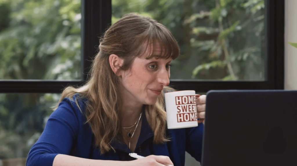 Two men and a woman sat round a desk having a meeting with a man on a video call in the background.